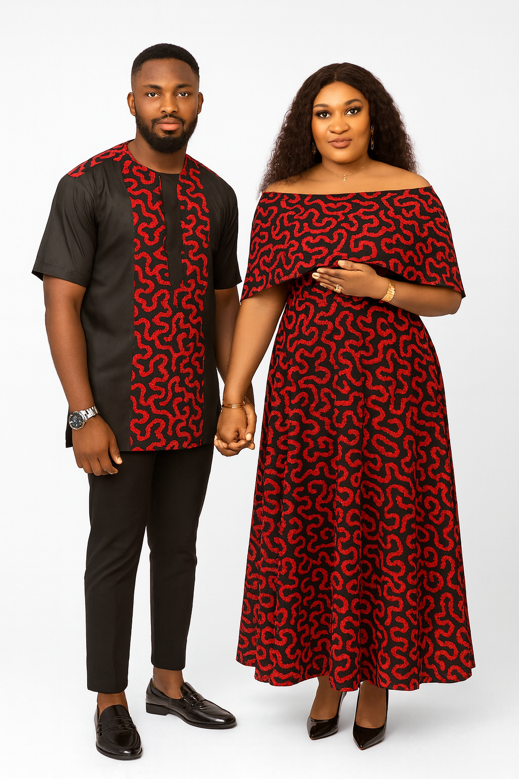 This striking couple’s outfit features a bold red and black swirled pattern. The man’s modern short-sleeve tunic complements the woman’s elegant off-the-shoulder maxi dress, making it perfect for a formal event.