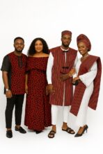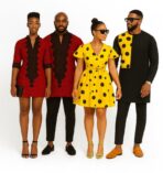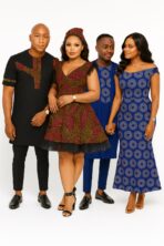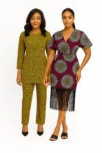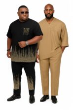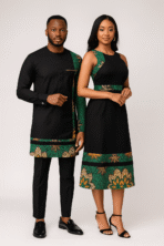 This coordinated couple’s outfit features a sleek black base with a vibrant green and gold print. The woman’s sleeveless dress with a fitted waist and the man’s long-sleeve tunic with matching accents create a sophisticated and stylish look.
