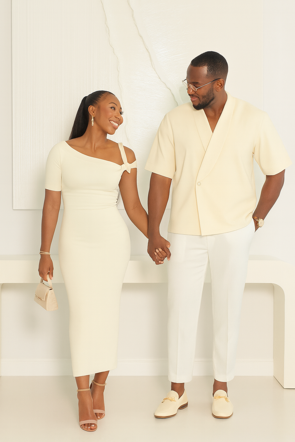 This classic and sophisticated outfit features a timeless ivory color. The woman’s fitted dress with a unique shoulder detail complements the man’s stylish, loose-fitting jacket and trousers, creating a perfectly coordinated and elegant look.