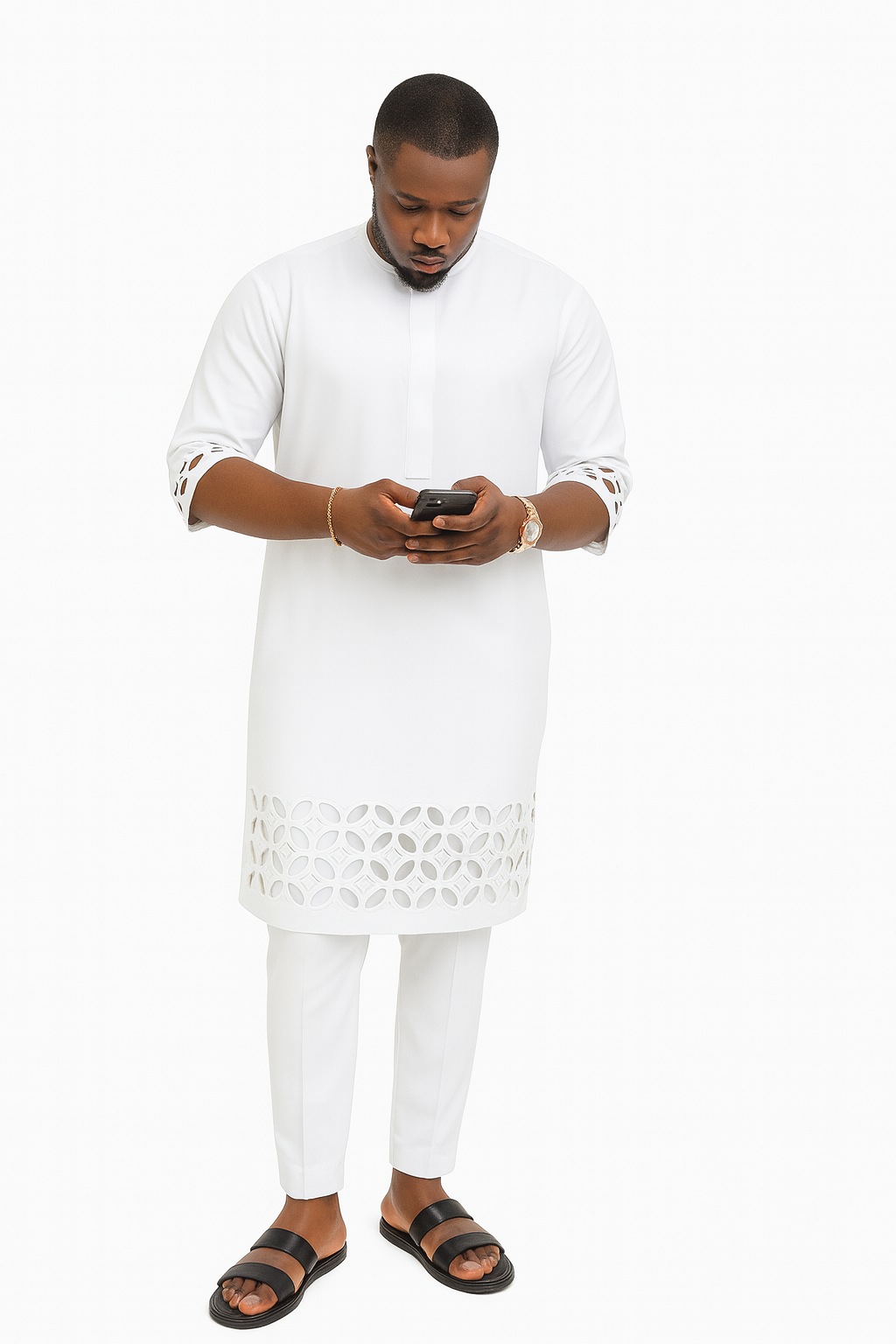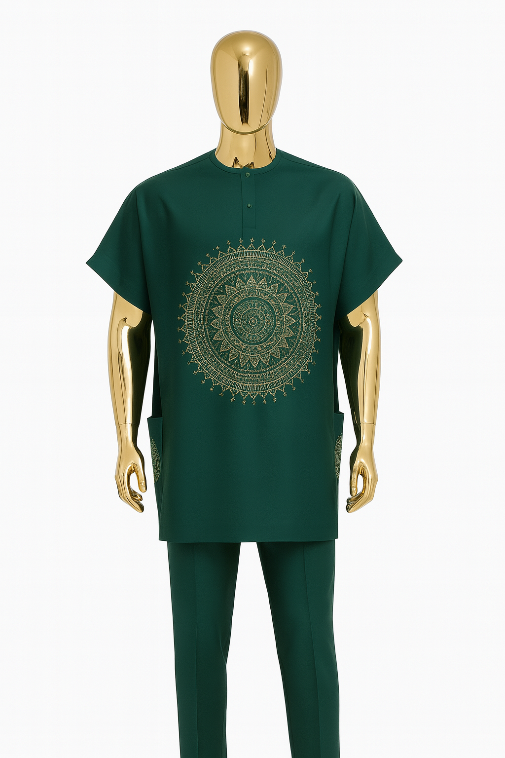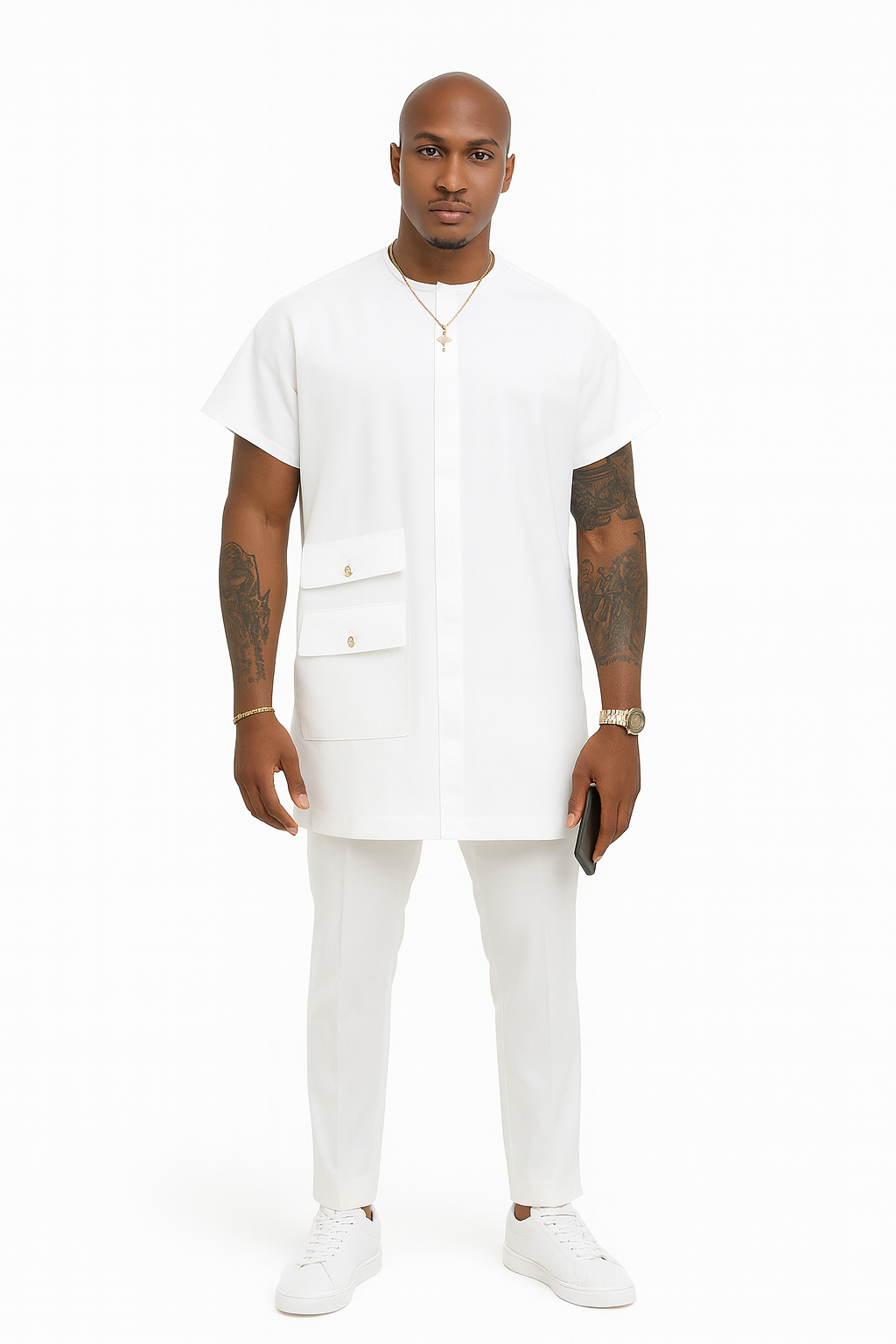 This outfit is the epitome of clean, modern style with a traditional twist. The two-piece set is crafted from a smooth, high-quality polyester-spandex blend fabric that provides a structured look while offering a comfortable stretch. The deep azure blue color is striking and versatile. The short-sleeved top features a split tunic hem and a sleek, button-free front placket, giving it a minimalist and contemporary silhouette. The matching trousers are tailored for a sharp, streamlined fit. This set is perfect for weddings, formal events, business functions, or special gatherings where a sophisticated and distinguished presence is desired.