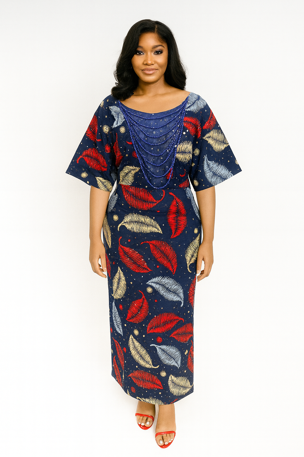 This beautiful maxi dress is perfect for a special event, combining a classic silhouette with a vibrant, modern print. The dress features a boat neckline, mid-length flutter sleeves, and a figure-flattering, empire waistline. The dark blue fabric is adorned with a striking print of large, stylized leaves in shades of red, gold, and light blue. A statement necklace made of layered blue beads is also included.