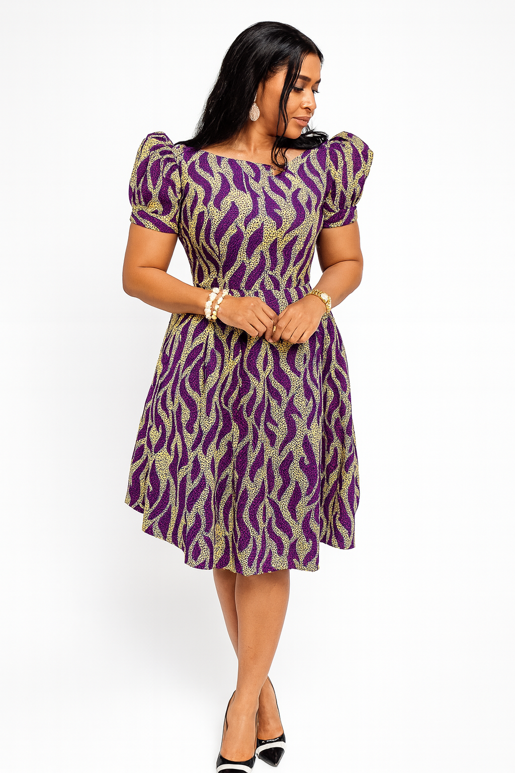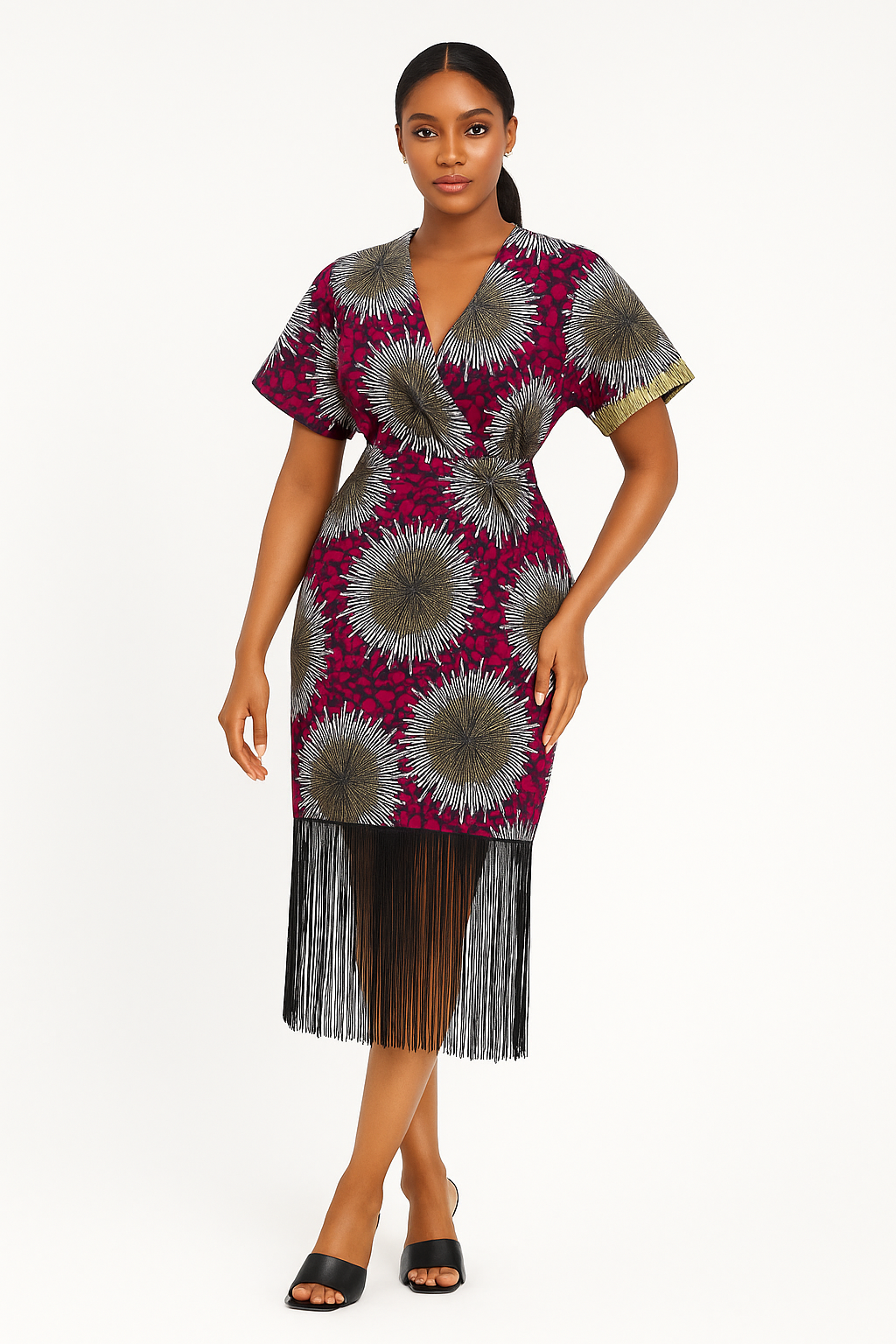 This beautiful dress is a stunning piece that blends a vibrant print with a playful, modern silhouette. The dress features a flattering V-neck, a cinched waist, and a unique knee-length hemline finished with long, black fringe that creates a sense of movement. The bold, all-over pattern in shades of red, gold, and white makes a strong visual impact.