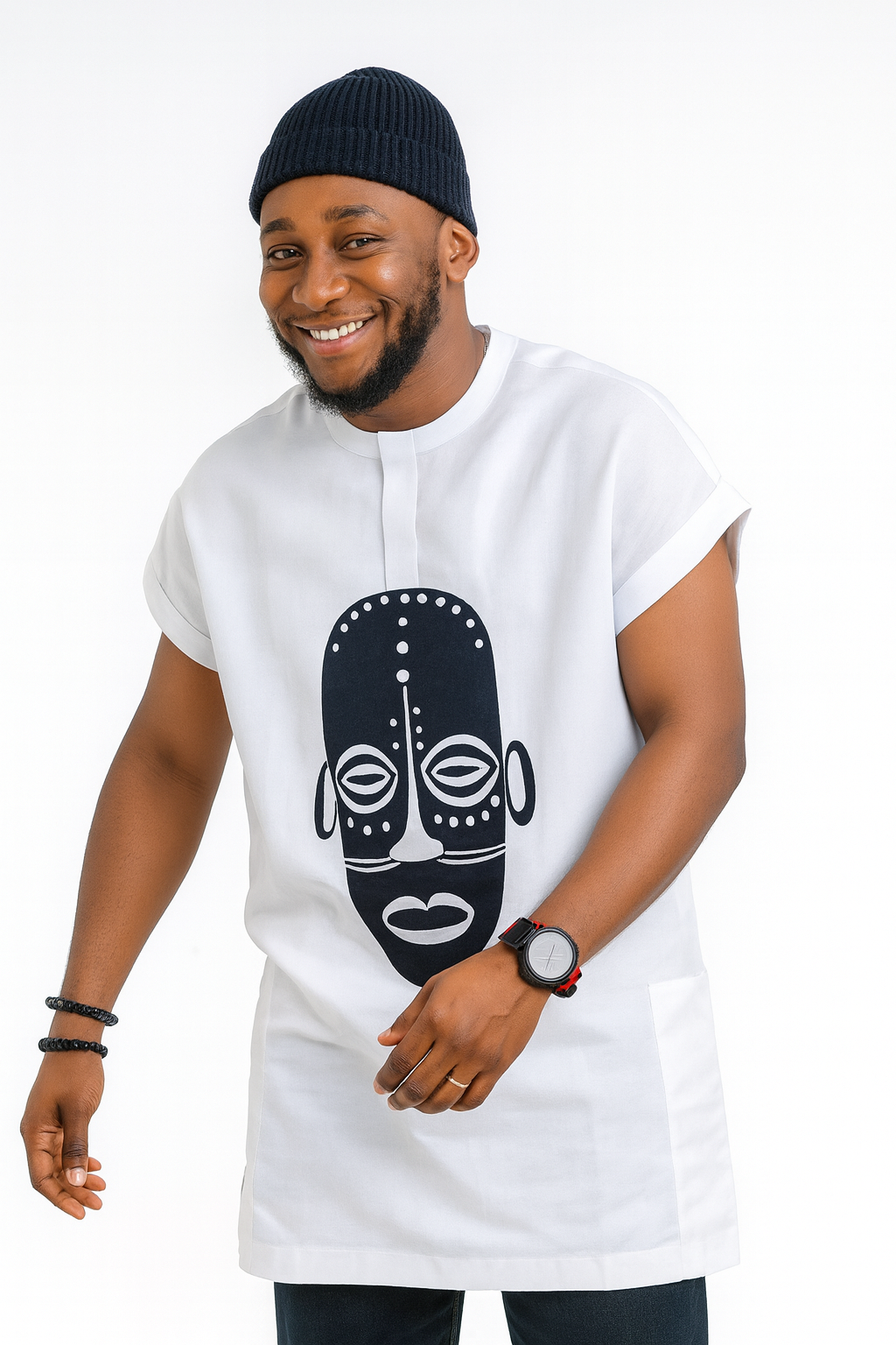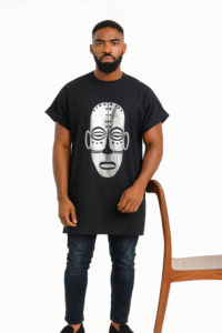 This is a bold and expressive piece for anyone who wants to make a statement. The top is made from a lightweight, crisp cotton fabric in a classic white color, offering a fresh and clean feel. The standout feature is the large, artistic tribal mask print in black, which is beautifully centred on the front of the tunic. The short, cuffed sleeves and simple round collar give it a modern silhouette. This tunic is best suited for casual gatherings, festivals, cultural events, or creative environments, where its unique design can truly be appreciated.